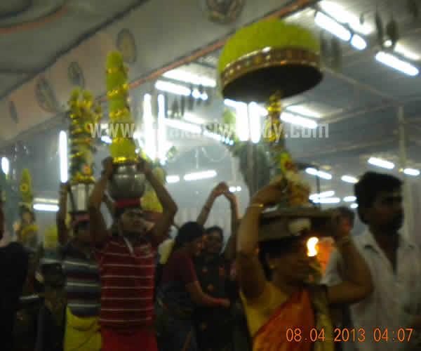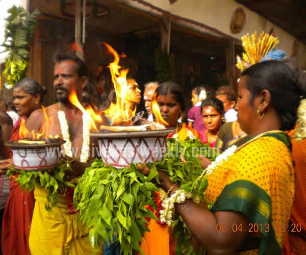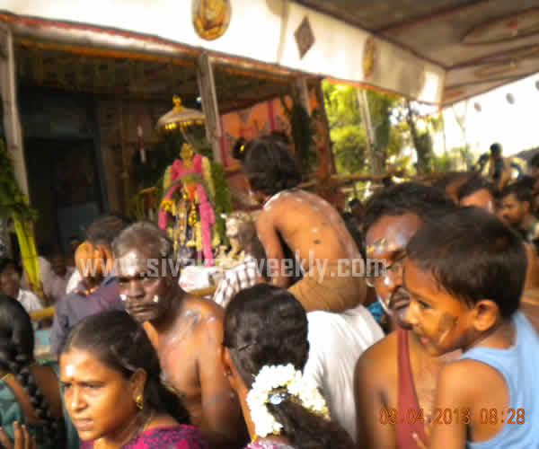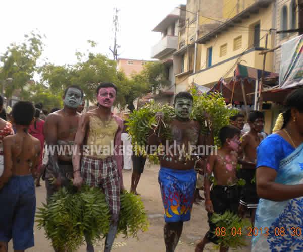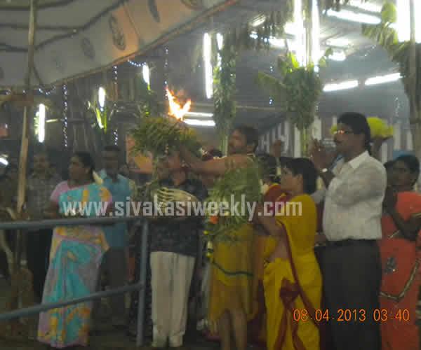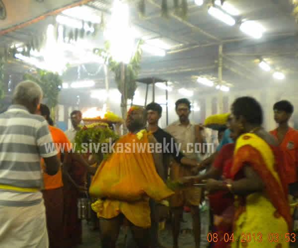 08-04-2013 8th April 2013 Kayirukuthu Utsav 2013 Sivakasi Mariamman Kovil Panguni Pongal - Kayirukuthu festival was celebrated in Sivakasi, today. Large number of devotees take part in Vesham Poduthal ( swearing of white and black dots in their body and having neem leaves in their hands ) and raised the Aahoi Ayyaahoi slogans. Devotees carried mulaipaari, agni chatti, 1000 kannu paanai, and maavilakku. Some devotees perform nerthikadan such as Padha Kaanikai, Kan Malar, Muthu Poduthal, Kayirukuthudhal and mottai podudhal. Sevaral fans club and Social Clubs in Sivakasi distributed free Butter Milks, Rose milk, Sarbath, Lemon Juices and Paanai Karam to the people. Procession has been taken place from Mariamman Kovil to Mandapadi place and the idol has been kept in Mandapadi and the idol will be kept once again in the temple by tomorrow. Today, at early morning, Dr.Kathiravan, Chairman, Sivakasi Municipality carried out Agni Chatti. Sivakasi Hindu Nadar Uravinmurai arranged the festival in a grand and in an systematic manner. The temple and police administration have made special arrangements to conduct the festival in a smooth manner. There was live coverage and broadcast of the festival by the local cable tv networks. Kayirukuthu festival entertains all sections of people in Sivakasi. |