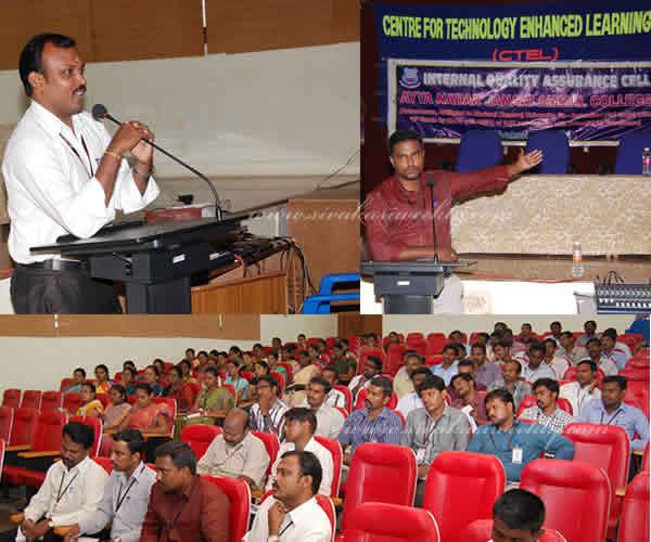 01-11-2014 1st November 2014 Courtesy: Ms.G.Karunya, Assistant Professor of Biotechnology, & Dean, Centre for Technology Enhanced Learning, ANJAC, Sivakasi On 30th October 2014, Centre for Technology Enhance Learning (CTEL) & Internal Quality Assurance Cell (IQAC) organized a Staff Development Programme to train the faculties on e - content designing & development, at Ayya Nadar Janaki Ammal College, Sivakasi. Dr.V.Pandiyarajan, Principal, inaugurated the training programme. Dr.R.Manohar, Dean, IQAC welcomed the gathering. Mr.T.Marimuthu, Assistant Professor, Department of Computer Application and Mr.B.Venkatesh, Assistant Professor and Head, Department of Visual Communication trained the faculty members on preparing e-content. About 85 faculty members from various disciplines attended the training. The training programme focuses on preparation of e-learning material in simple topics with the objective of micro teaching. |