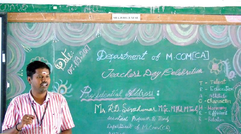 05-09-2017 Teachers Day Celebrations was organized by the Department of M.Com. (Computer Applications) on 05.09.17. Teachers Day Address and Presidential Address by Mr.R.D.Sivakumar, M.Sc.,M.Phil.,M.Tech., Assistant Professor, Department of Computer Science and Assistant Professor and Head, Department of M.Com. (Computer Applications) ANJAC , Sivakasi. |