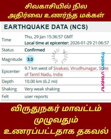 01-02-2026 Mild Earthquake Jolts Sivakasi In Sivakasi and most of the towns in Virudhunagar District, a light earthquake with a magnitude of approximately 3.0 on the Richter scale struck near Sivakasi on the evening of Thursday, January 29, 2026, prompting surprise and concern among local residents. According to seismic monitors, the quake occurred around 9:06 PM (IST) at a shallow depth of about 9.7 km just west of Sivakasi. The tremor was felt across several towns and villages in Virudhunagar district, including Sivakasi, Srivilliputhur, Sattur, Elayirampannai, Seithur, Thiruthangal, Krishnan Kovil, and nearby areas. Residents reported: Light shaking of buildings and homes, causing people to rush outside in fear. Household items like photos, clocks, and kitchenware falling off shelves in some places. A few locals described hearing a rumbling sound prior to the ground shaking. Despite the initial alarm, no major structural damage, injuries, or casualties have been reported. Officials monitoring seismic activity have reassured the public that the earthquake was mild and within the range of minor tremors often recorded in the region. Local authorities and disaster management officials have advised residents to stay calm and exercise standard safety precautions during minor tremors. They also encouraged people to continue monitoring verified seismic updates and avoid spreading misinformation. Earthquakes in Tamil Nadu are relatively uncommon and typically low in magnitude when they occur. Most tremors recorded in the state in recent years have been mild, with magnitudes rarely exceeding 3.0–3.5 on the Richter scale. Rajan a Sivakasian reported that India Today Tamil magazine had warned 25 years ago that Sivakasi and Thiruthangal are located in an earthquake-prone belt in the Indian map, and the warning has now come true. |